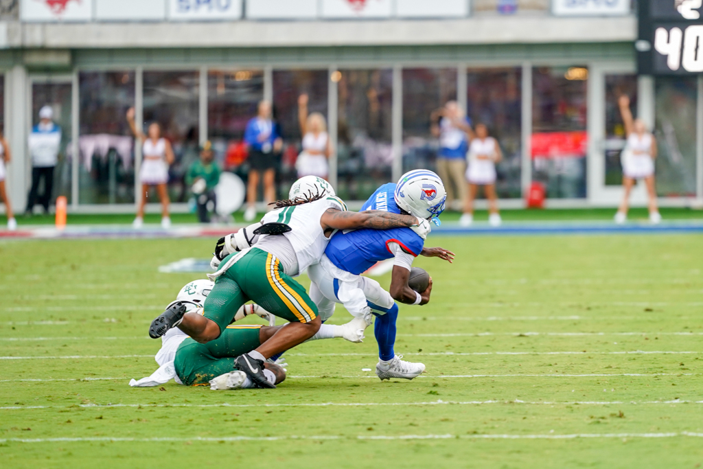 Mustangs quarterback Kevin Jennings was spectacular in defeat, throwing for 296 yards and three touchdowns. Jennings connected with Romello Brinson on two scores—one from 75 yards on the game’s opening play and a 25-yarder in overtime. He also hit freshman Jalen Cooper for a 75-yard strike late in the second quarter.