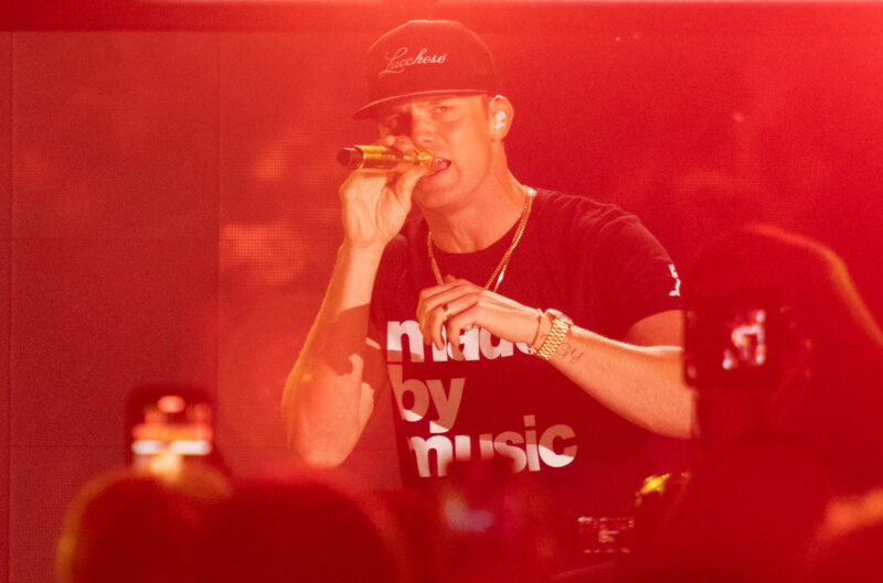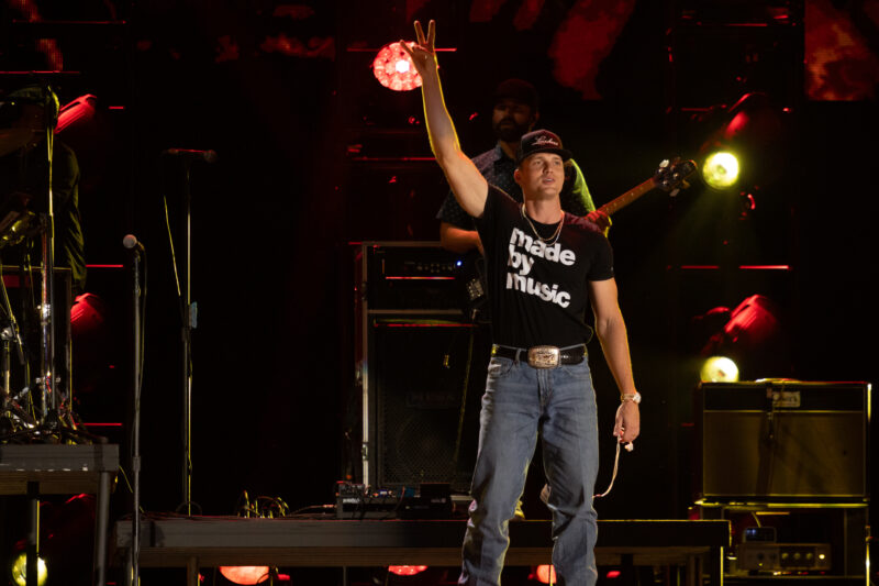 As the sun set, Jelly Roll took the stage to introduce Parker McCollum. Bathed in red light, McCollum began with “To Be Loved By You,” sporting a black baseball cap, blue jeans, and a black t-shirt that read “made by music.” He followed with “Pretty Heart” and “Young Man’s Blues,” then declared “God bless country music” before performing “Handle On You” and the unreleased “Big Old Fancy House.” McCollum, honored to be on stage with such talent, thanked his label and the audience. He grasped his gold mic for “Burn It Down,” descending the stage stairs to interact with fans.