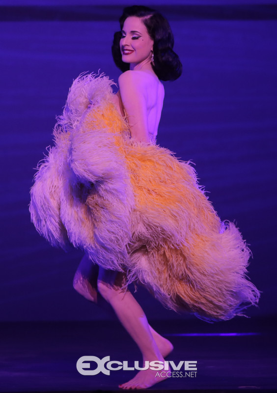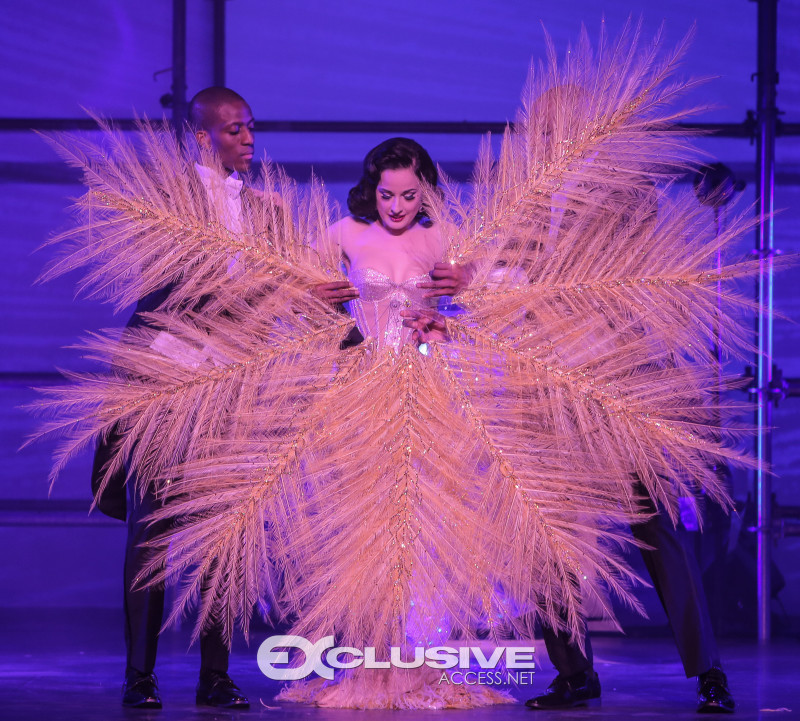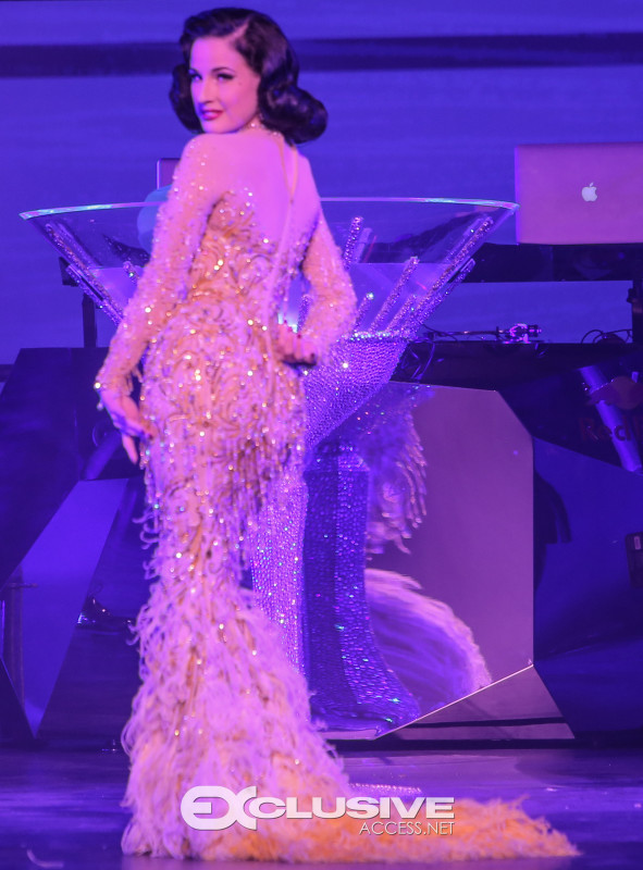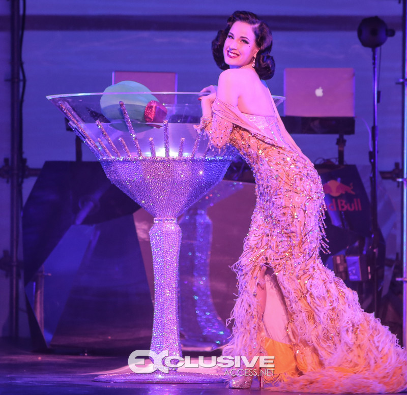 Dita Von Teese kicked off the show with a sparkly burlesque performance, slinging off her disco-ball heels before swirling around in giant martini glass prop.