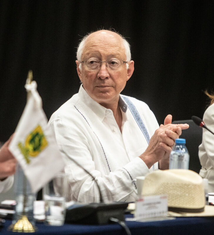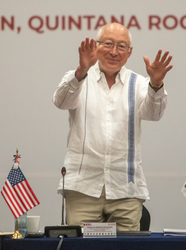 La coordinadora de la Comisión Sur-Sureste de la Conferencia Nacional de Gobernadores (CONAGO), María Lezama Espinosa, acompañada del embajador de Estados Unidos en México, Ken Salazar, inauguró la octava reunión con la embajada de los Estados Unidos de América en Cancún.