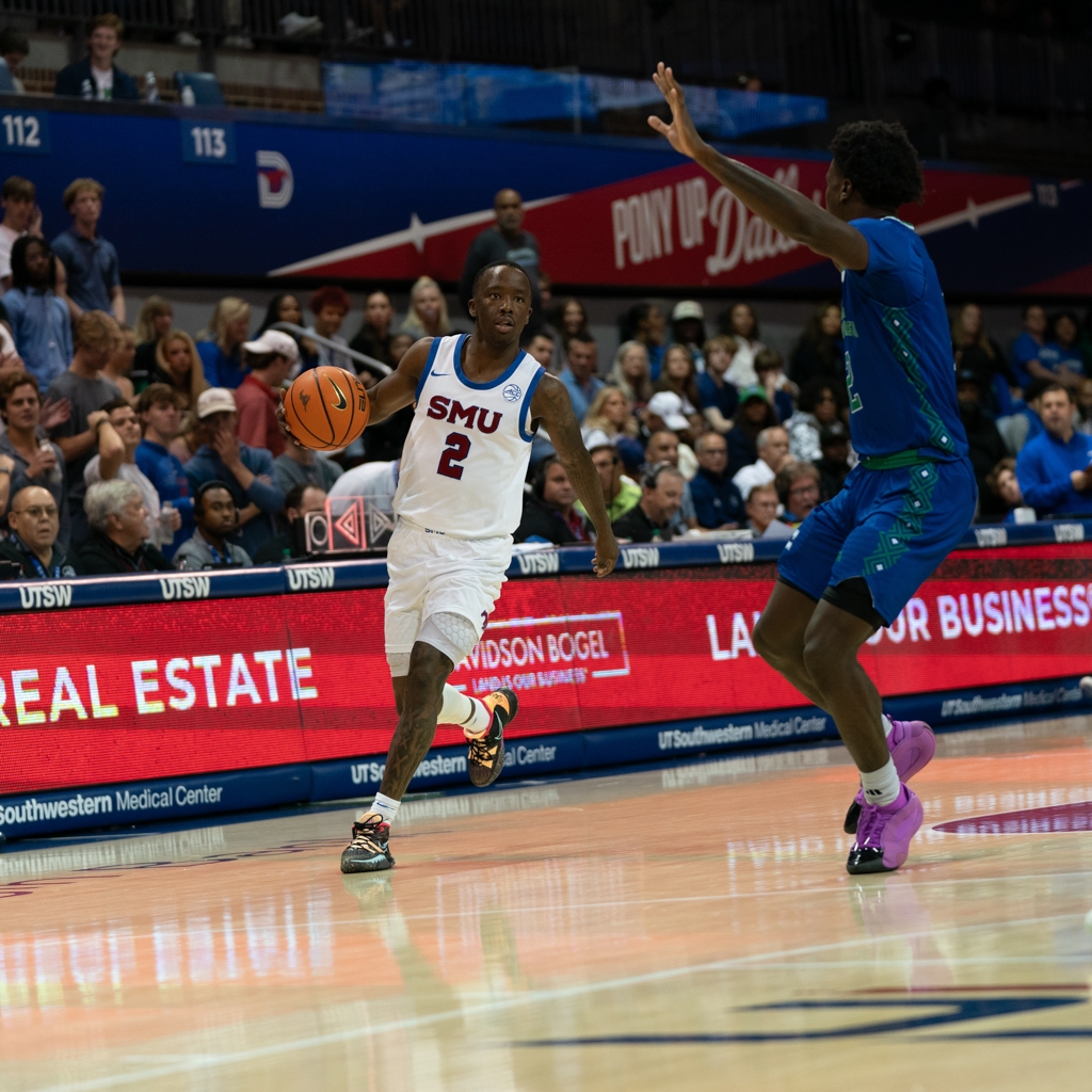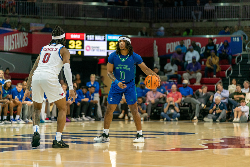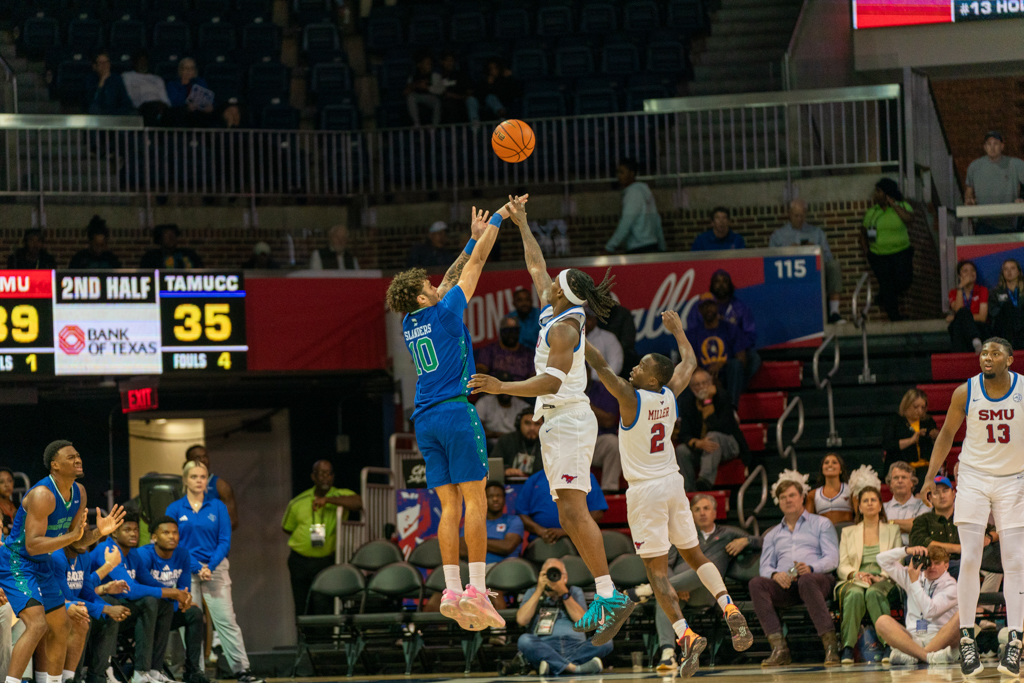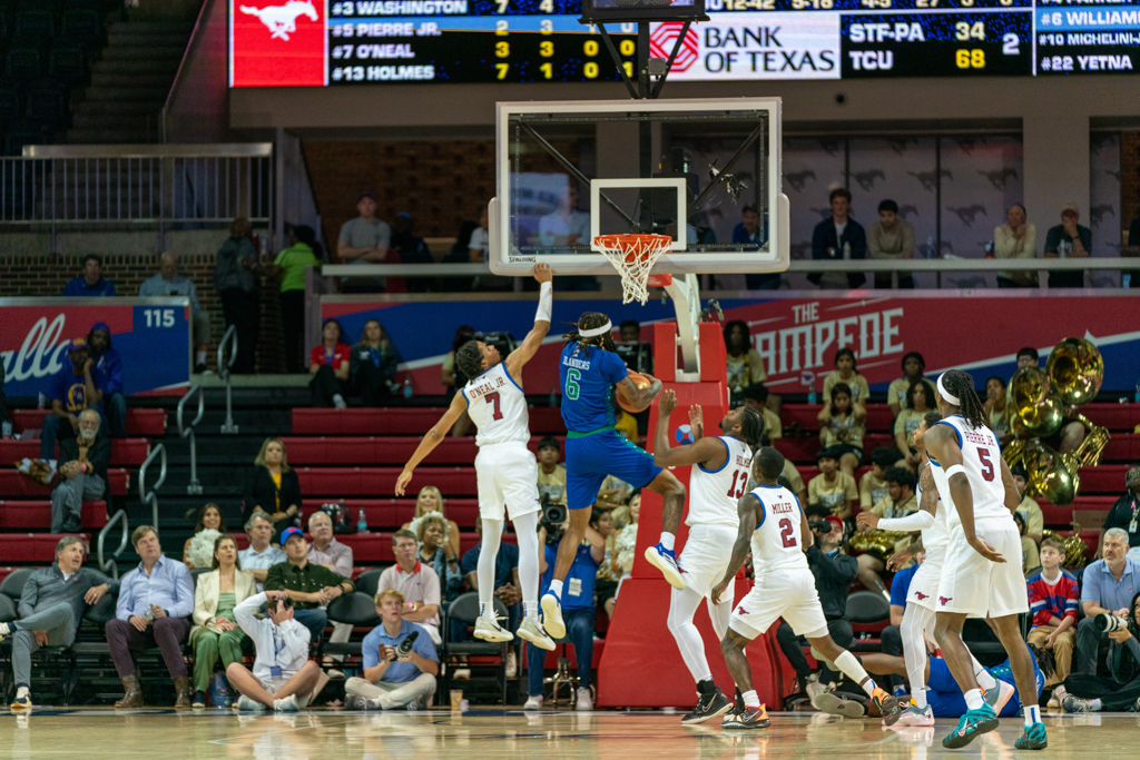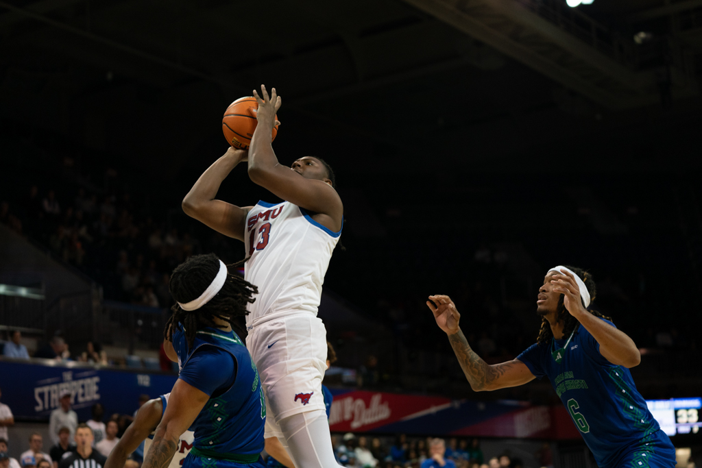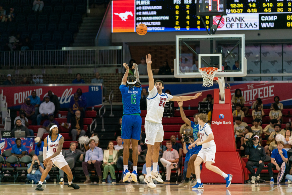After senior forward Corey Washington scored the first basket of the night, the Mustangs struggled to connect, surrendering the lead for most of the first half. SMU didn’t pull back ahead until the final four minutes before the break. The defense, however, locked in—holding the Islanders scoreless for seven straight minutes until a late 3-pointer from junior guard Daniel Michelini-Jackson cut into the gap just before halftime.