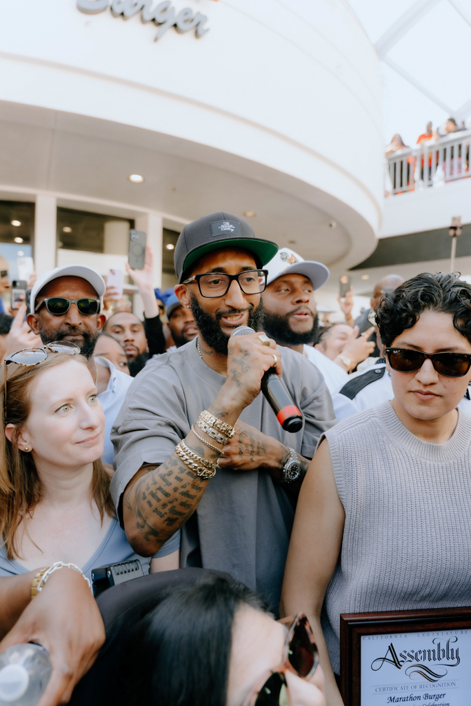 Marathon Burger the fast-growing burger brand launched by the estate of late rapper Nipsey Hussle opened its newest location this weekend in downtown Long Beach.
