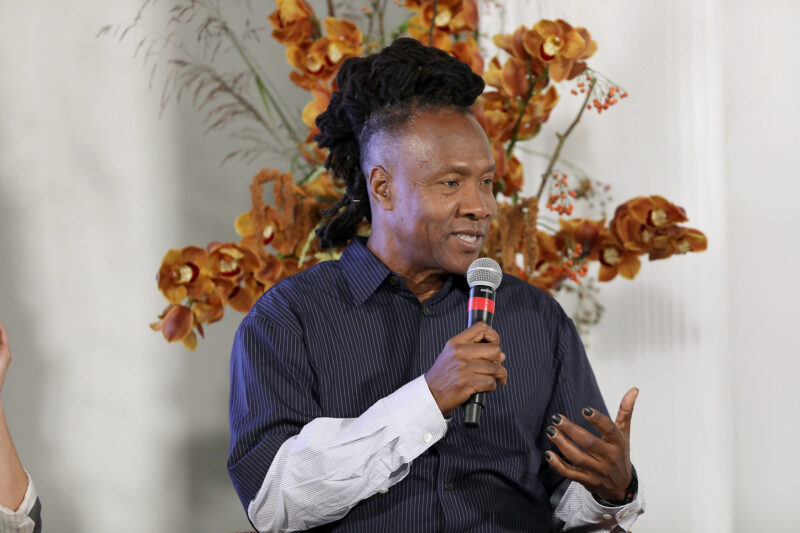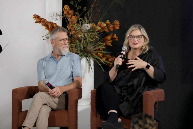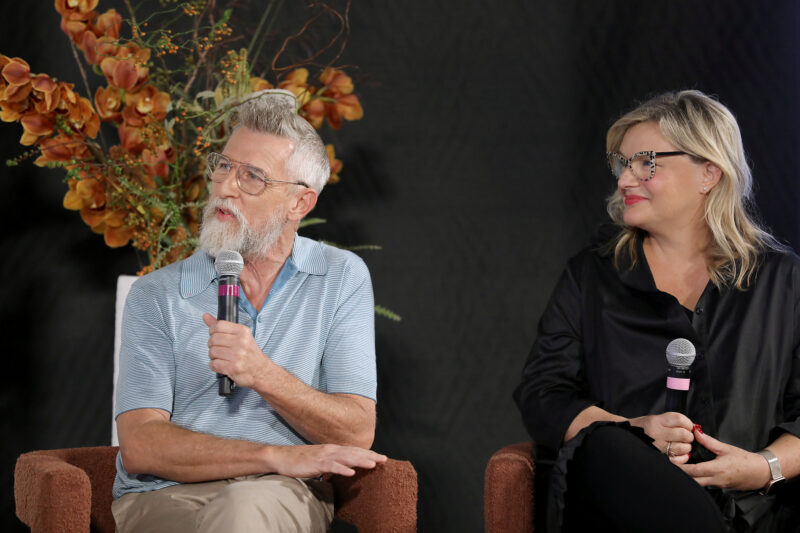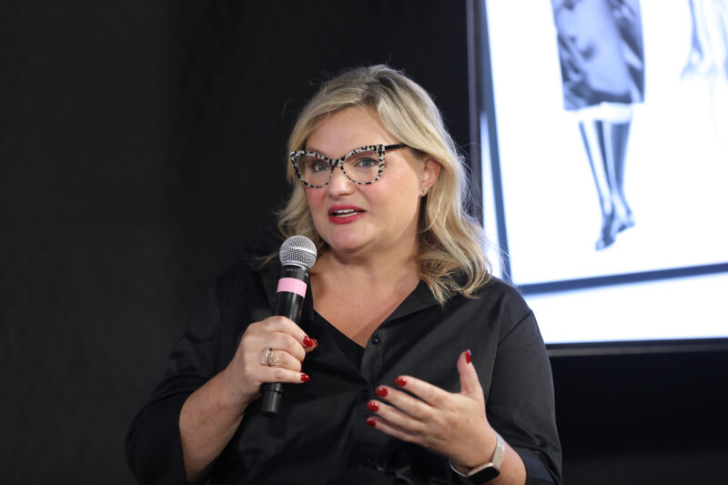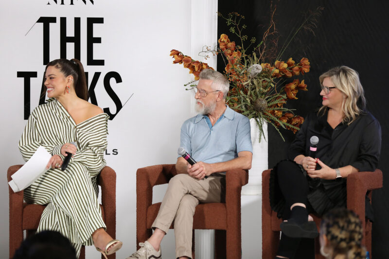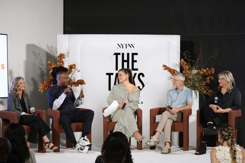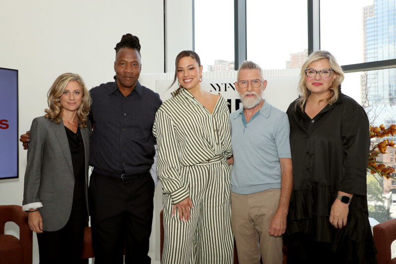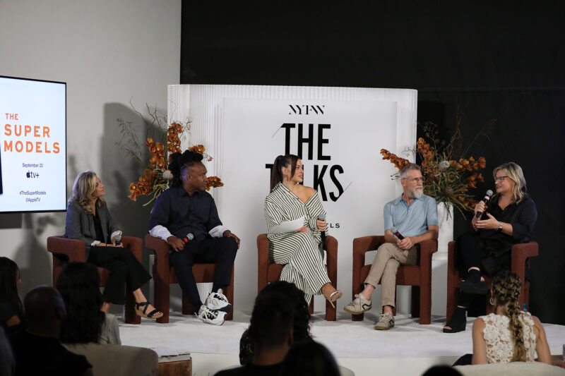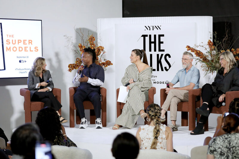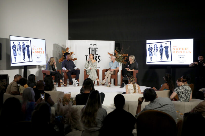Supermodel and Entrepreneur Ashley Graham (C) moderates a NYFW The Talks panel for “The Super Models” coming to Apple TV+,featuring (L to R) Executive Producer Sara Bernstein, Director and Academy Award Winner Roger Ross Williams, Designer Todd Oldham and Director and Producer Larissa Bills