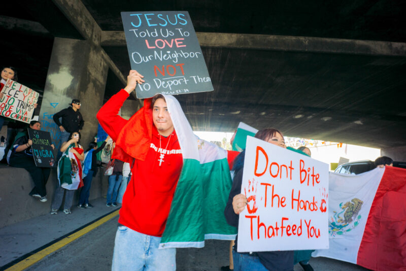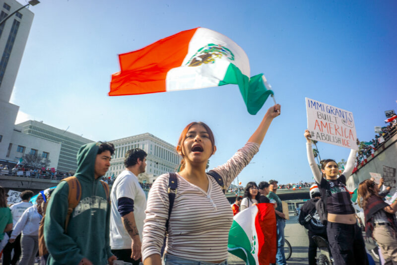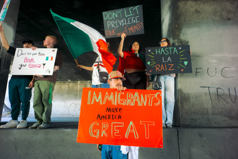 Video footage captured over 1,000 passionate protesters occupying both sides of the freeway just after noon. Many carried U.S. and Mexican flags, while others held signs with messages such as “Immigrants Built This Country,” “Fight Against Fascism,” and “Americans Are Immigrants,” while also condemning ICE.