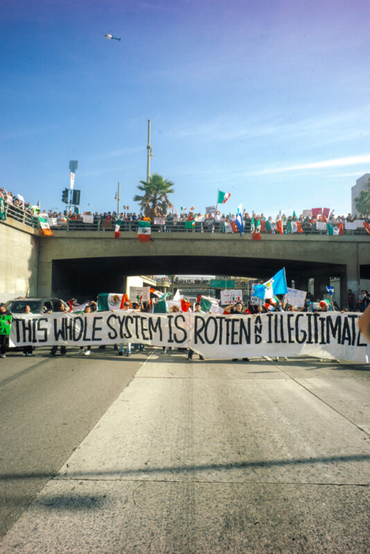 Although LAPD initially described the demonstration as peaceful, by 1 p.m., traffic gridlock was reported on Spring, Main, and Los Angeles Streets, as well as Arcadia and the 101 Freeway in downtown Los Angeles.