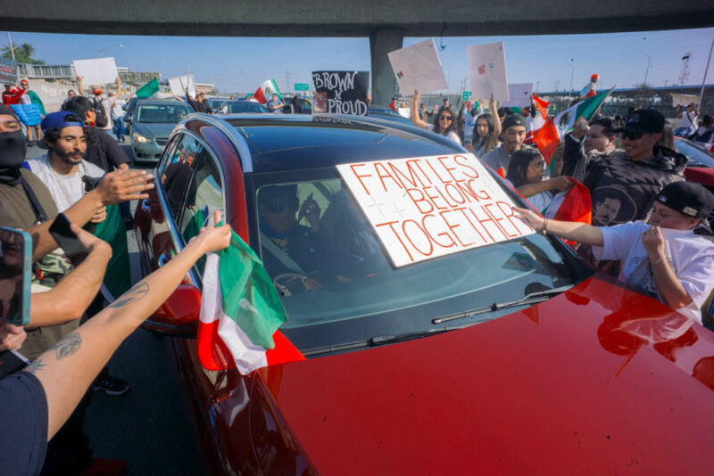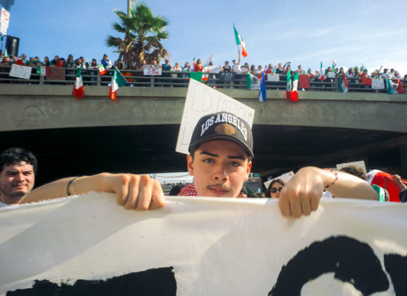 In Los Angeles, a large group of demonstrators blocked both sides of the 101 Freeway near the Alameda Street exit. Protesters had initially assembled on Olvera Street for what the Los Angeles Police Department described as an unauthorized demonstration. The crowd, numbering in the thousands, marched to City Hall before many moved onto the freeway.