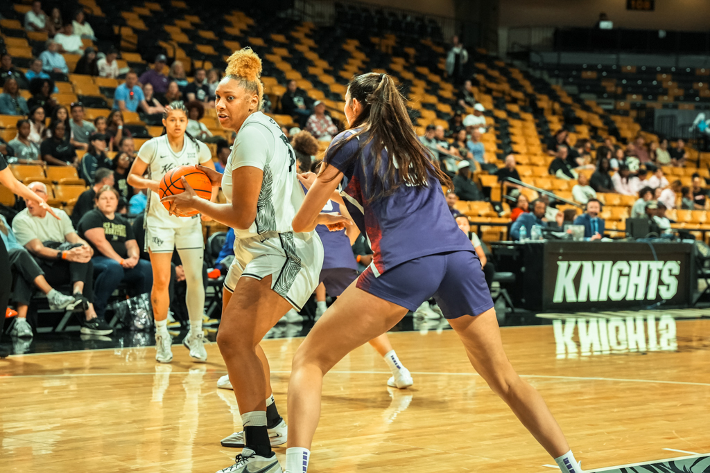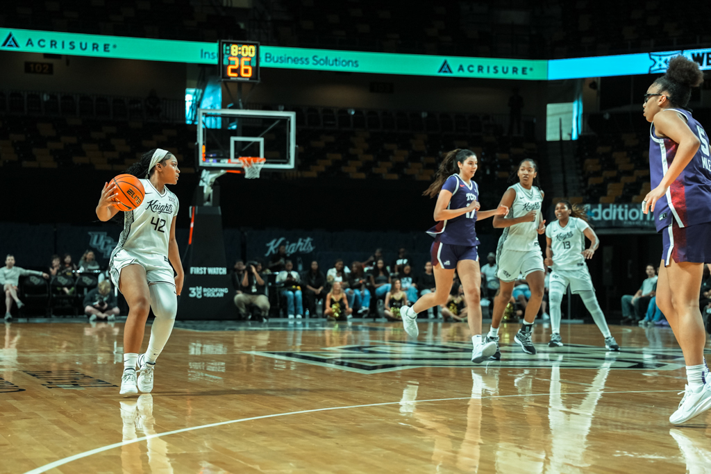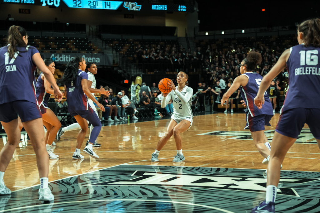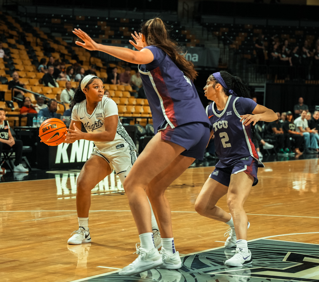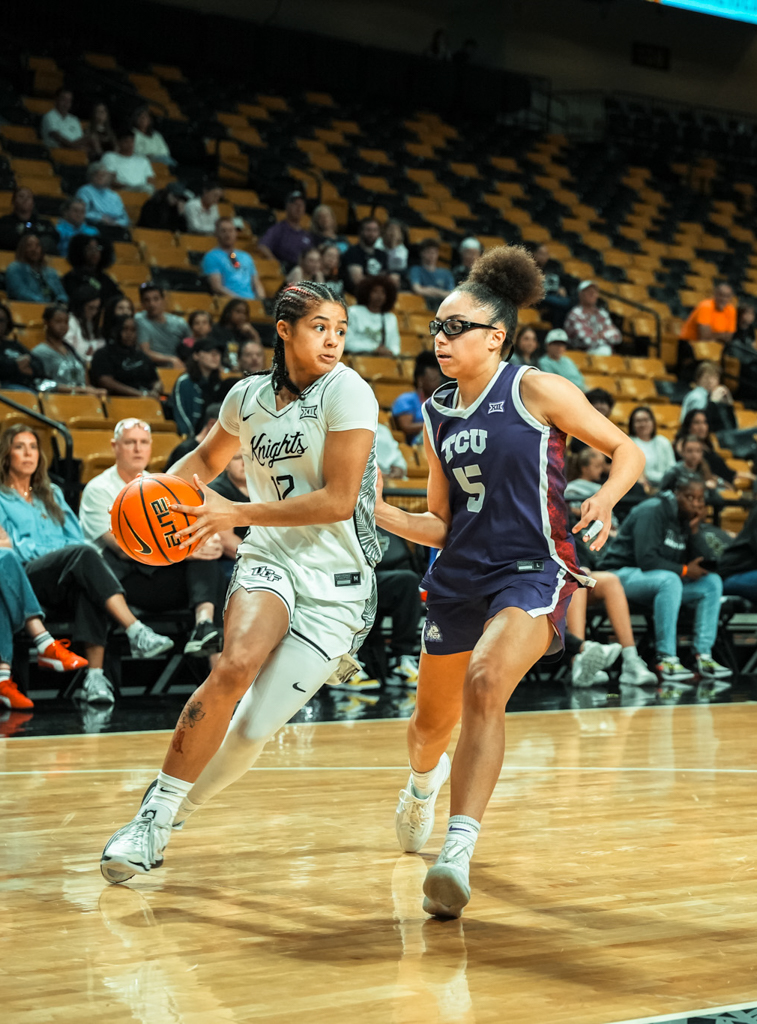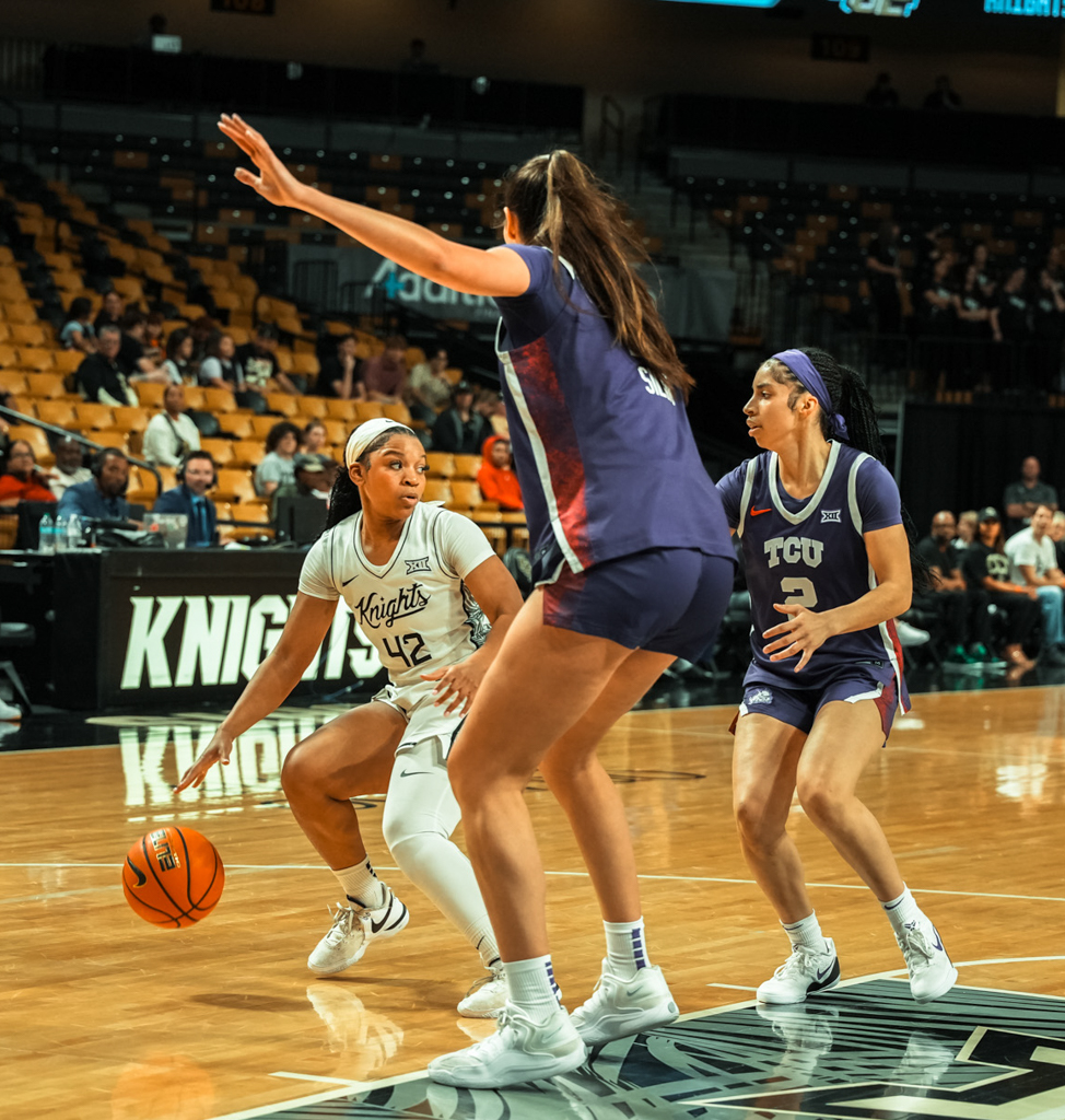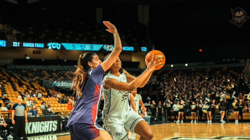 Chandler-Robert provided an early spark for the Knights, scoring seven points in the opening quarter, including her fourth three-pointer of the season. Out of the timeout, TCU went on a 9–0 run before Khyala Ngodu ended the drought with a tough finish at the rim. The Horned Frogs continued to stretch the floor with outside shooting, opening lanes inside and extending their lead.