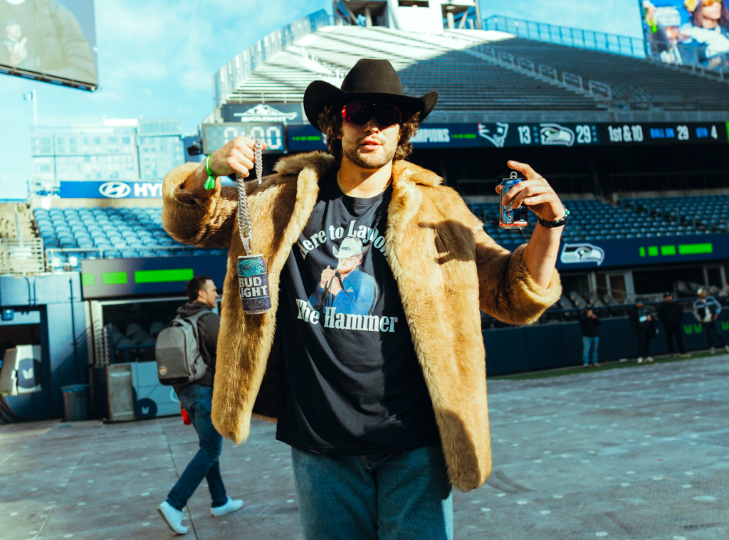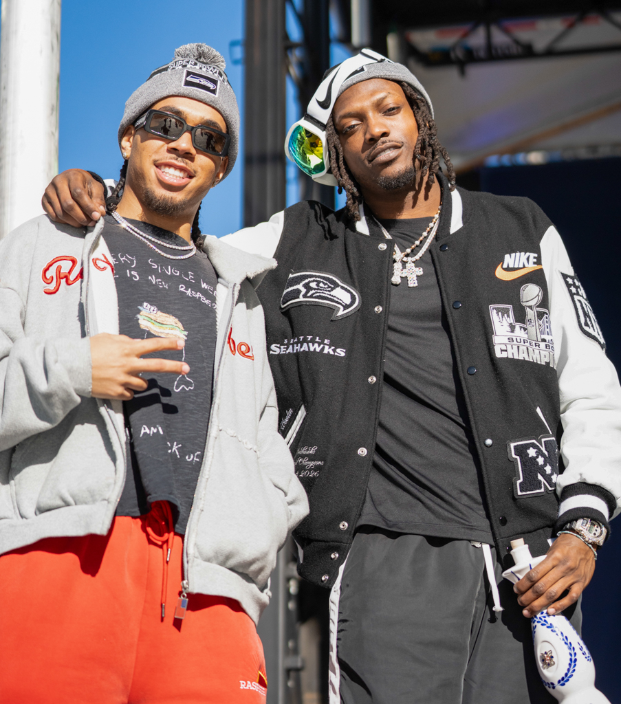 The fashion statements were just as bold as the celebration. AJ Barner rocked a black cowboy hat and fur coat, Jaxon Smith-Njigba sported a Canadian tuxedo with his No. 11 jersey, and Leonard Williams showed off a custom WWE championship belt. Smiles stretched across every face as they soaked in the love from the crowd.